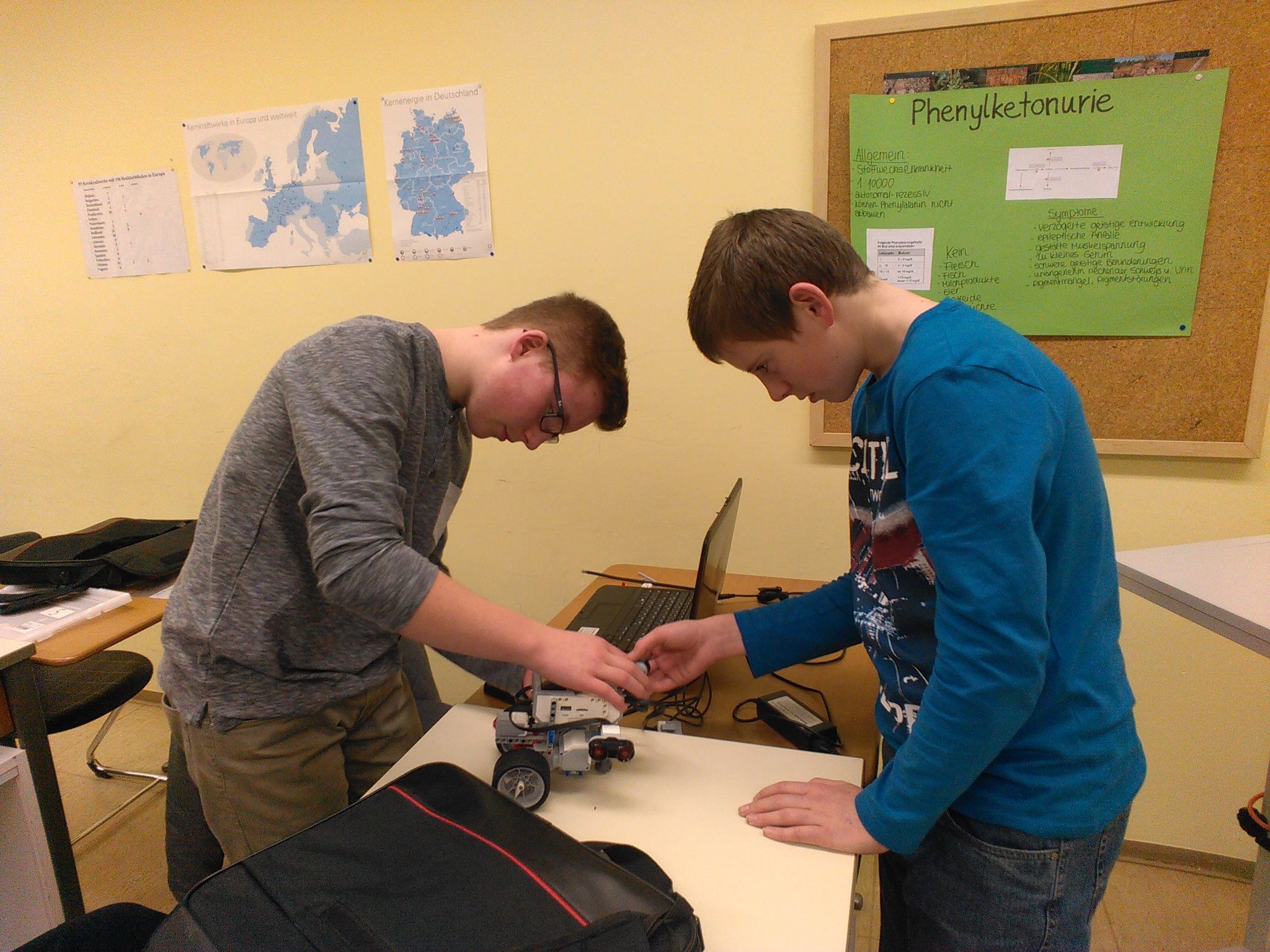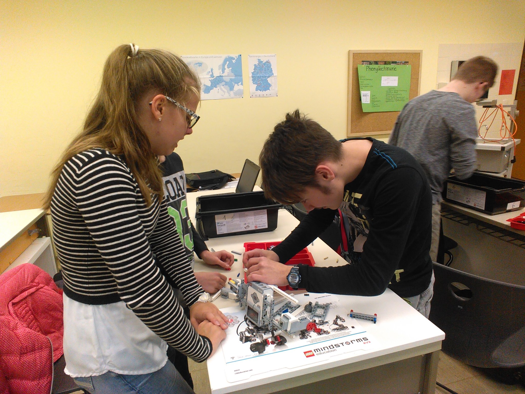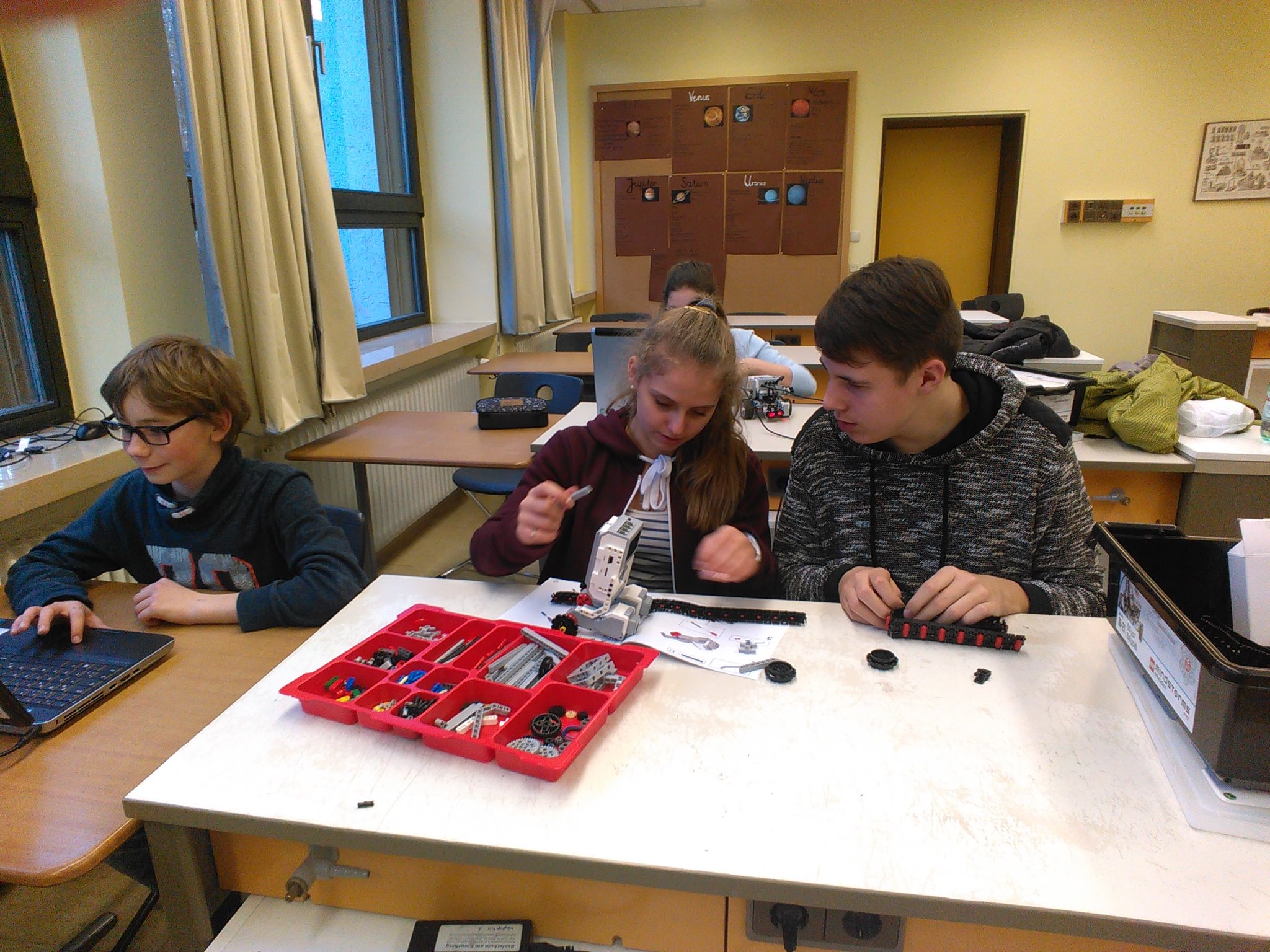 Trockner nähern. Es wurden aber auch schon Geldautomaten, Roboter die über Treppen gehen können oder eine Anlage, die je nach Einstrahlstärke des Sonnenlichtes ein Solarmodul optimal ausrichtet, konstruiert. Hierfür stehen den Schülern sowohl Konstruktionsbaukästen von Fischertechnik und auch das Lego Bausystem MINDSTORMS EV3 zur Verfügung. Darüber hinaus beteiligen wir uns auch an Wettbewerben.