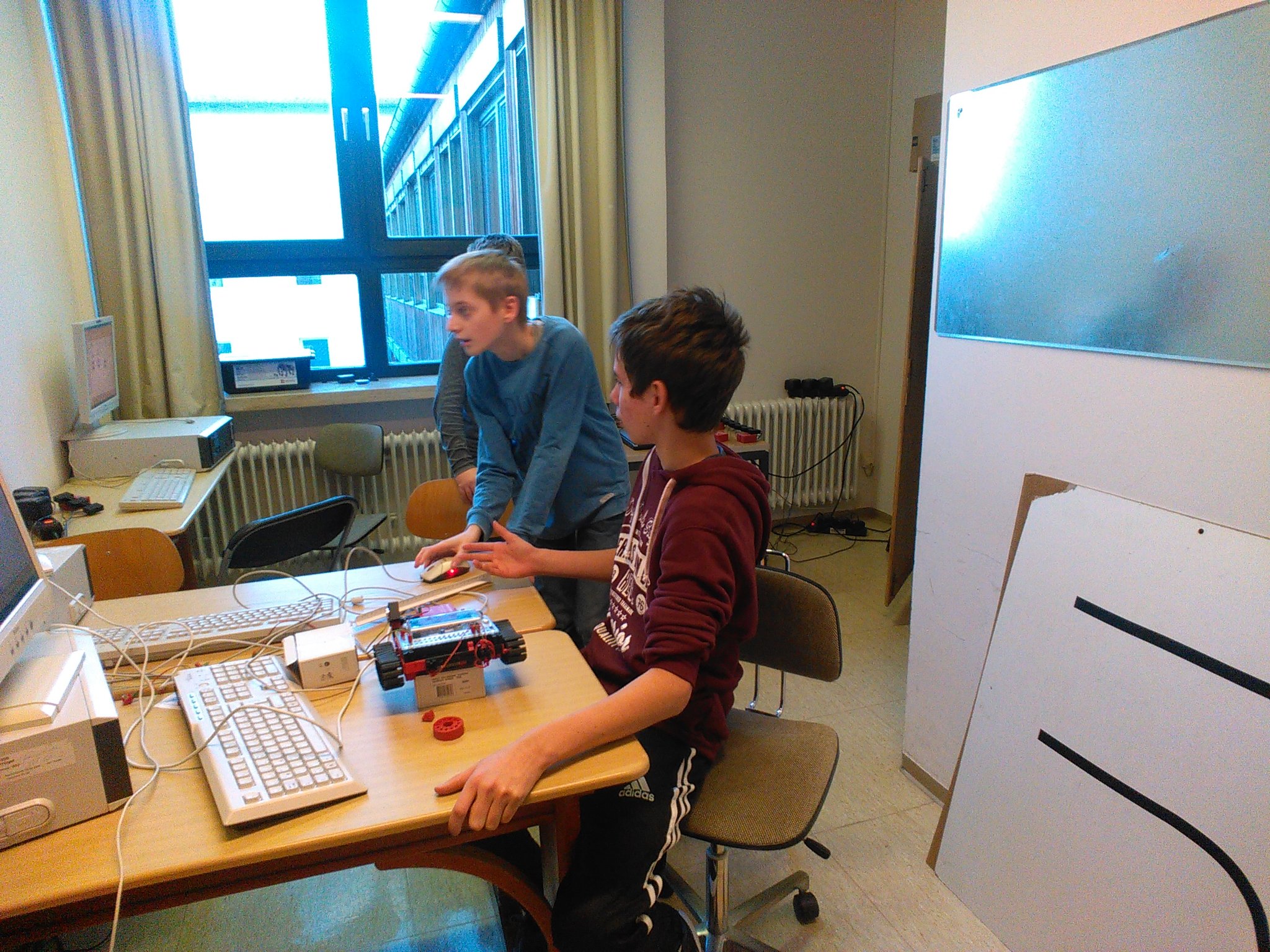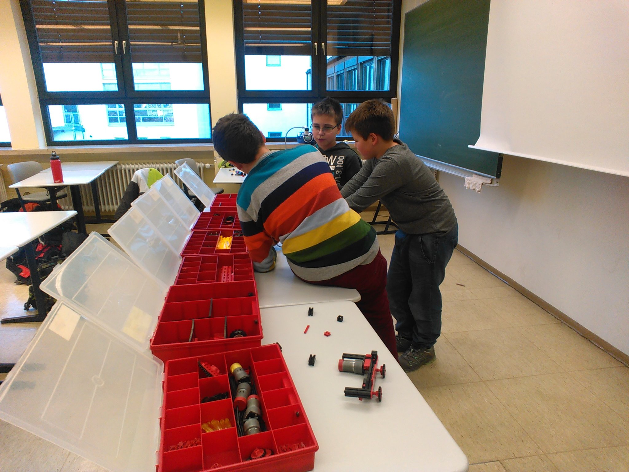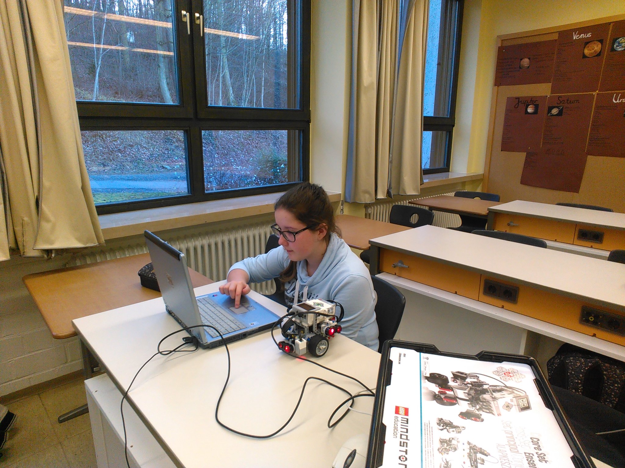 Trockner nähern. Es wurden aber auch schon Geldautomaten, Roboter die über Treppen gehen können oder eine Anlage, die je nach Einstrahlstärke des Sonnenlichtes ein Solarmodul optimal ausrichtet, konstruiert. Hierfür stehen den Schülern sowohl Konstruktionsbaukästen von Fischertechnik und auch das Lego Bausystem MINDSTORMS EV3 zur Verfügung. Darüber hinaus beteiligen wir uns auch an Wettbewerben.
